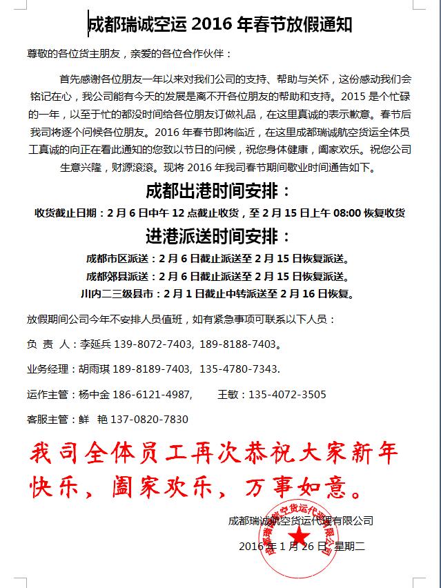 成都瑞誠(chéng)航空貨運(yùn);成都瑞誠(chéng)航空快遞;成都瑞誠(chéng)航空物流 四川空運(yùn)物流集團(tuán)有限公司 股東會(huì)員單位之一 業(yè)務(wù)、咨詢、訂艙、電話: 028-8588 4670 028-85884680 客戶服務(wù)經(jīng)理:羅 莉:181-0822-9452 客戶服務(wù)經(jīng)理:胡雨琪:189-8189-7403 客戶服務(wù)經(jīng)理:王 玲:189-8088-6984 客戶服務(wù)經(jīng)理:潘曉燕:181-0822-2047 客戶服務(wù)經(jīng)理:胡小姐:138-8081-5006 駐機(jī)場(chǎng)操作負(fù)責(zé)人:胡林:134-5861-8897 服務(wù)意見與建議:李延兵:139-8072-7403 2021年后搬遷至:成都市機(jī)場(chǎng)南貨運(yùn)路6號(hào) 機(jī)場(chǎng)空運(yùn)收貨點(diǎn):成都雙流國(guó)際機(jī)場(chǎng) 機(jī)場(chǎng)南貨運(yùn)6號(hào)四川空運(yùn)物流集團(tuán)(成都瑞誠(chéng)航空物流) 導(dǎo) 航:搜索"四川空運(yùn)物流集團(tuán)"、"成都瑞誠(chéng)航空快遞"、"成都瑞誠(chéng)航空貨運(yùn)" "今日達(dá)航空貨運(yùn)"四川空運(yùn)物流集團(tuán)"等都可找到公司位置。